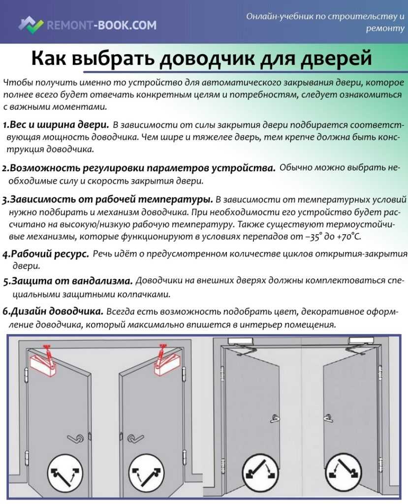 Для каждого типа двери необходимо правильно выбирать доводчик — устройство и регулировка всех функций аппарата, должны выполняться так, как рекомендует инструкция по эксплуатации. Установка прибора на дверь снижает нагрузку на петли при передвижении полотна.