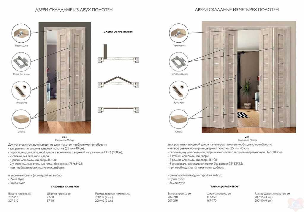 Двухсекционные варианты состоят из пары синхронно складывающихся и раскладывающихся секций, которые, как правило, имеют одинаковые размеры. В четырехсекционных экземпляров, конечно же, имеется больше секций, что позволяет сократить ширину каждой из них и сделать двери более удобными в эксплуатации.