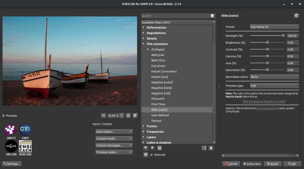 G’MIC — это графический framework (набор программ и билиотек с исходным кодом) используемый при работе с изображениями. Позволяет производить над изображениями всевозможные действия и накладывать различные фильтры (всего 491 фильтр). Работает, как отдельно приложение (командная строка или GUI), так и плагин для GIMP и Krita. Есть так же библиотека всех функций G’MIC, которую вы можете подлинковать в свое приложение. То есть это настолько мощный агрегат, что способен конкурировать с именитыми платными аналогами. Сегодня, из всего богатого инструментария G’MIC нам потребуется только «эмулирование пленочного цвета».