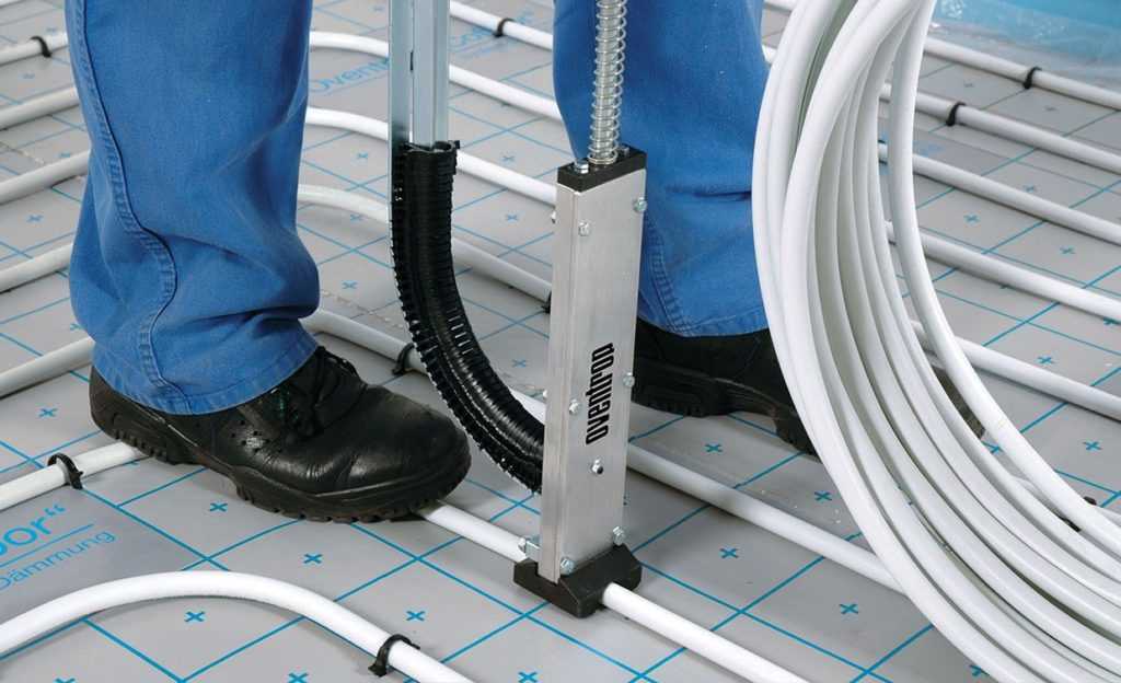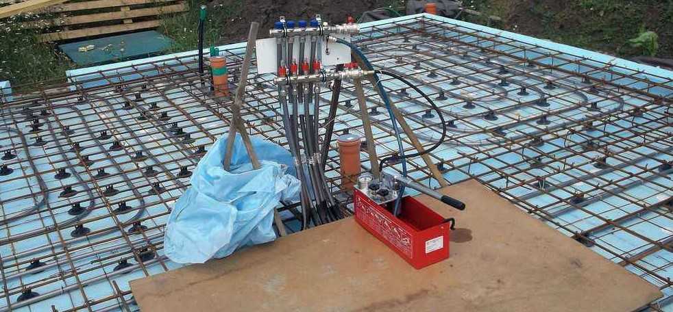 Необходимо заранее рассчитать расположение водопровода, канализации и электрических кабелей, ведь после окончания что-то изменить будет крайне затруднительно, а порой, вообще, невозможно. Также нужно проверить горизонтальное расположение всех труб по отметкам. После установки труб подключается коллектор, который монтируется на металлические стержни.