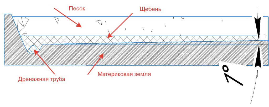 Дойдя до слоя глины важно сформировать небольшой уклон от центра к периметру границ с уклоном около 1% (1 см на метр). При такой разуклонке воды будут стекать по материковому слою глины в дренажную систему