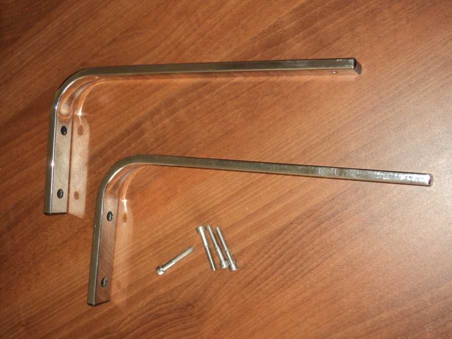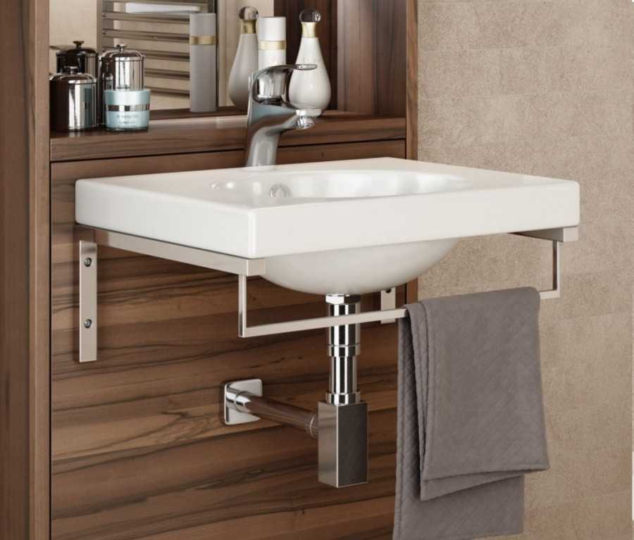 Специализированные кронштейны могут обладать витиеватой формой, подходящей под стиль умывальника. Защитную функцию по борьбе с коррозией берет на себя керамический слой или антикоррозийное вещество. В большинстве случаев используют никелированное и анодированное покрытие.