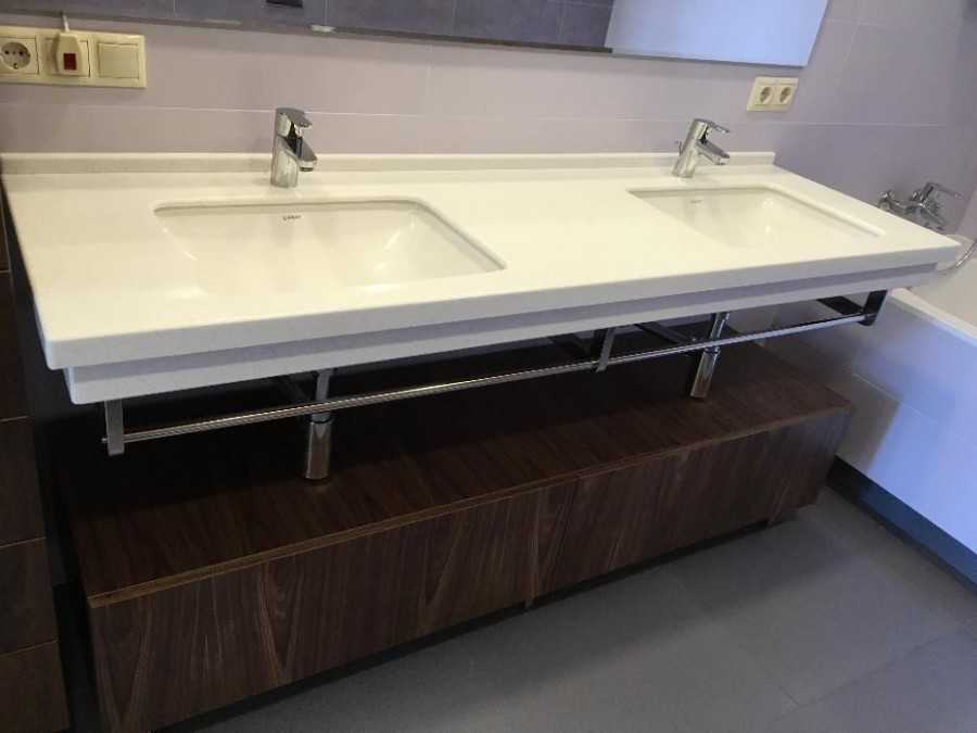 - По окончании того как кронштейны смонтированы, остаётся на них одеть умывальник и проверить уровень качества произведенной работы.