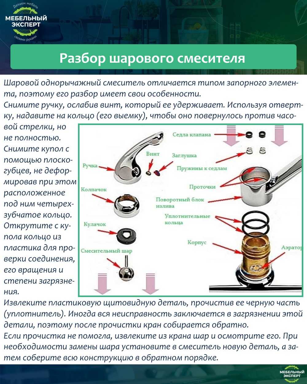 Чтобы разобрать однорычажный шаровый смеситель в ванной или на кухне, придерживаются похожей схемы.