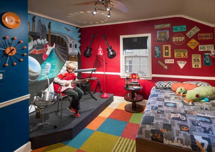Другой идеей для мальчика от школьного возраста до подростка являются геометрические фигуры. Стильные разноцветные треугольники, квадраты и ромбы, выложенные в виде мозаики, выглядят креативно, ярко и очень оригинально.