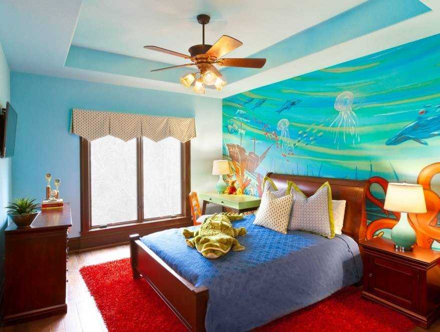 Моря и океаны – классическая тема для дизайна детской спальни мальчика. Здесь могут быть нарисованы не только моря с его волшебными обитателями, но и атласы мира, карты сокровищ. В качестве покровителей этих богатств выступают веселые пираты.