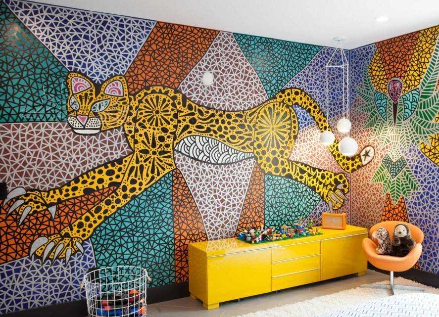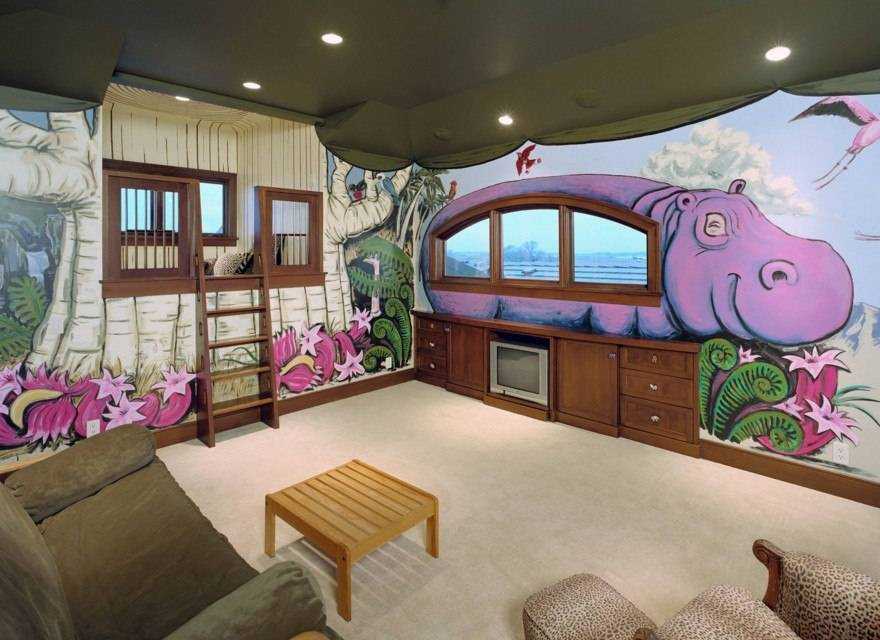 Детская самое место для воплощения фантазий, но дополнительные ограничения на характер росписи стен в детскую комнату накладывает психофизиология детского зрения. Первое, четкие яркие пятна насыщенных цветов тут недопустимы. Психика ребенка, живущего в комнате вроде той, что слева на рис., если не исковеркана уже, то к тому придет, разве что родители догадаются заменить рисунок.