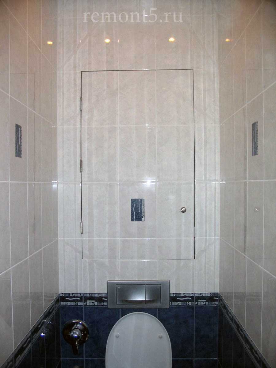 люк для сантехнического шкафа в туалете средних размеров. В основном находится за унитазом. В этой ситуации, помимо того, что закрываются трубы, остается место для установки нескольких полок. Размер такого люка обычно не превышает 50×70 см.