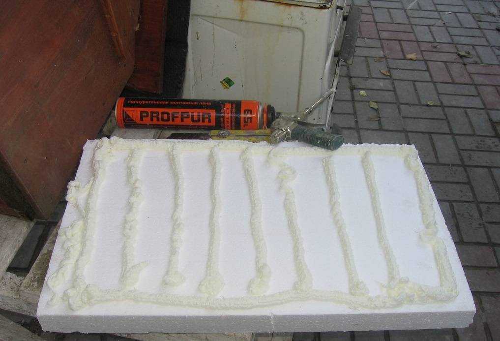 - Далее фиксируют пласты полистирола на специальный клей. На листы утеплителя лучше наносить пенофол, изготавливаемый из фольги.
