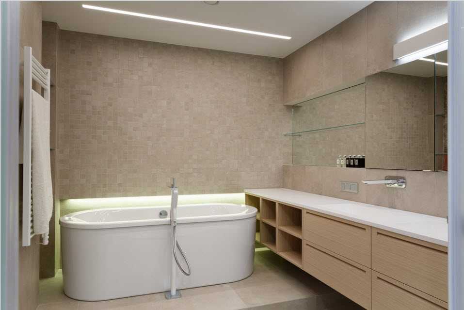 Нижний уровень освещения используют для создания особого настроения и релаксации. Встроенные светодиодные ленты и светильники в бортиках ванной, нишах и прочих деталях интерьера зрительно расширяют пространство, усиливают эффект романтической атмосферы.