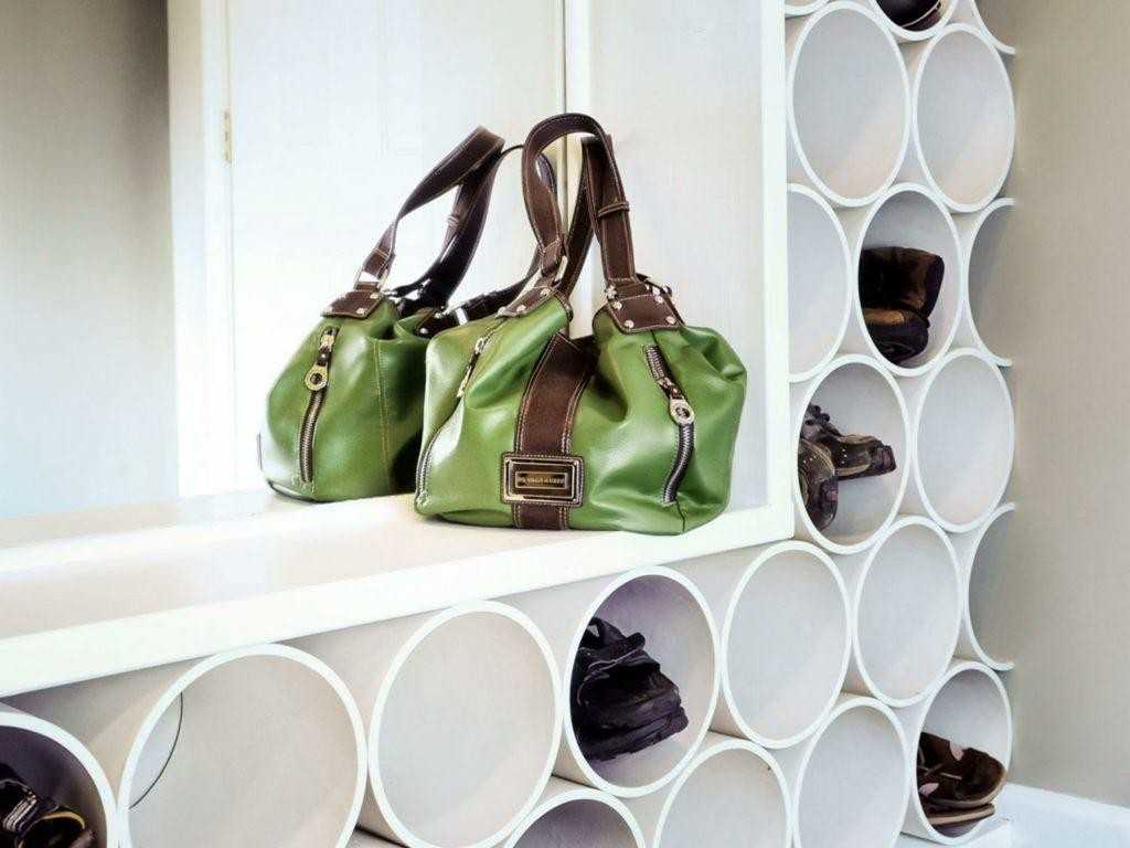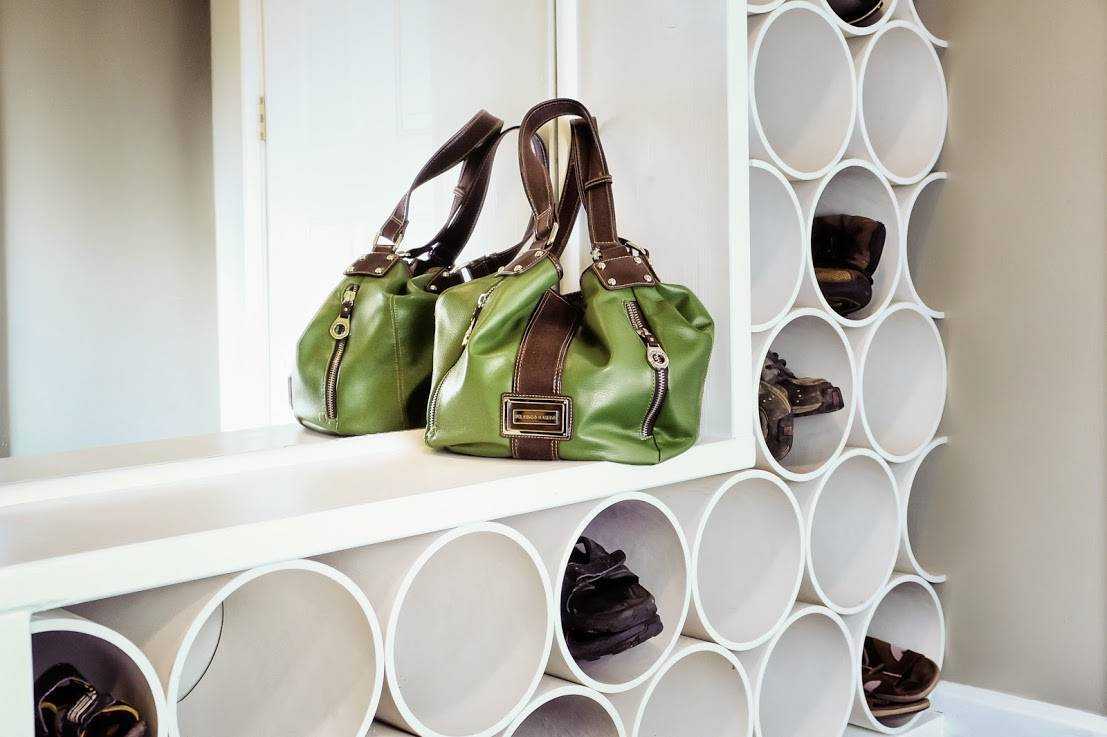 Обычно труба из ПВХ скрывается за гипсокартоном, но здесь она занимает центральное место в качестве основы для еще одной креативной подставки для обуви, которую можно сделать своими руками.