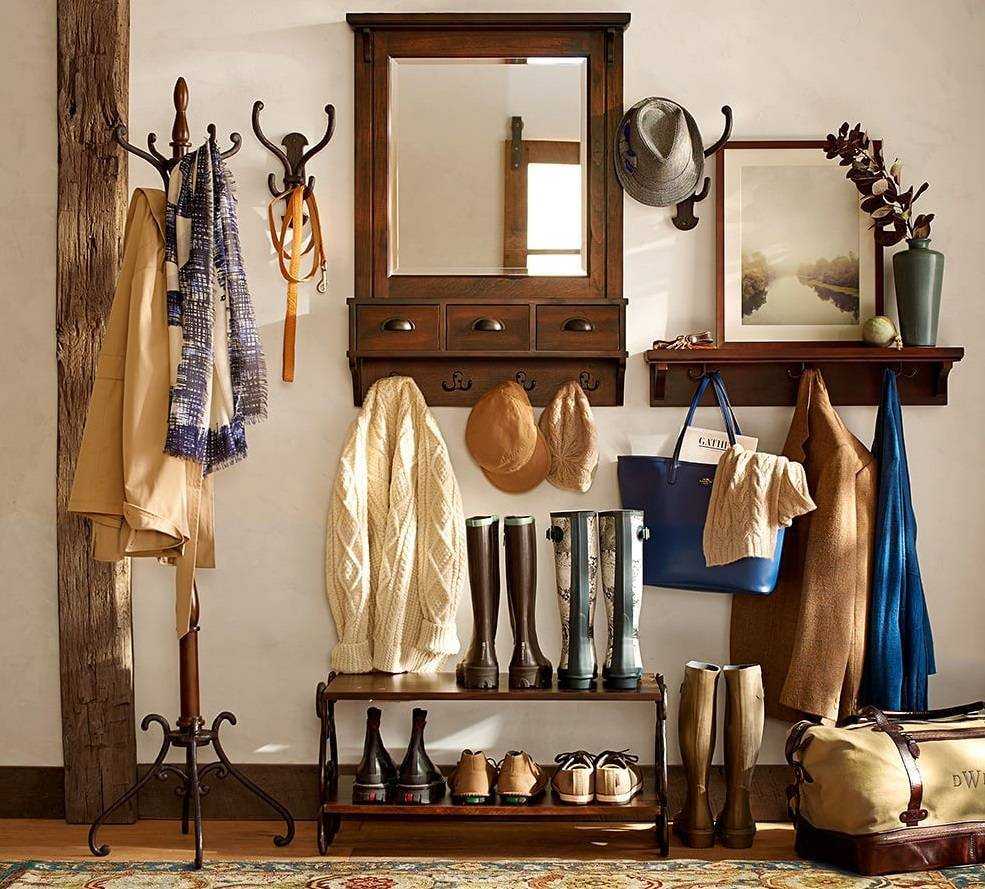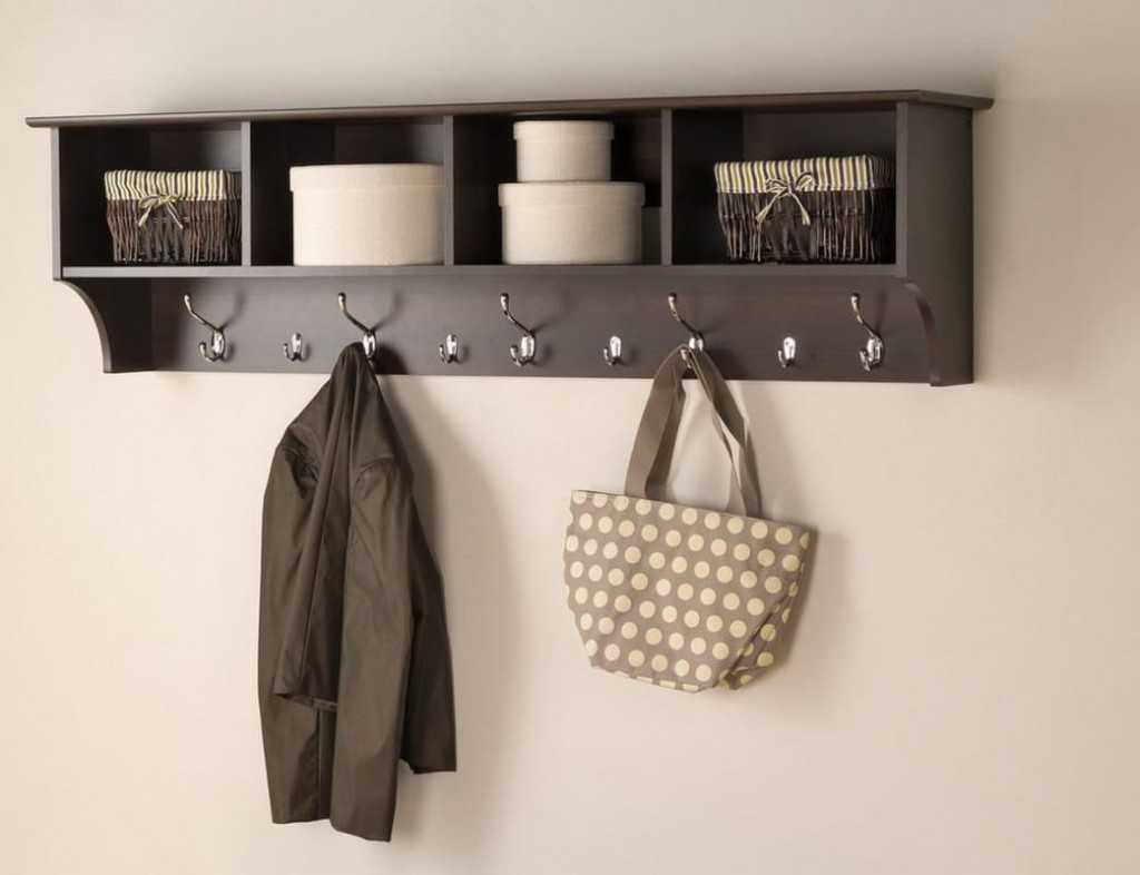 В любой прихожей необходимо определить место для верхней одежды. Эти вешалки могут быть навесные и напольные. Настенные предполагают наличие крючков, над которыми есть полочка для головных уборов, шарфов и т. п. Крючки могут быть большие и маленькие, располагаться в несколько рядов, что дает возможность вешать туда и зонты.