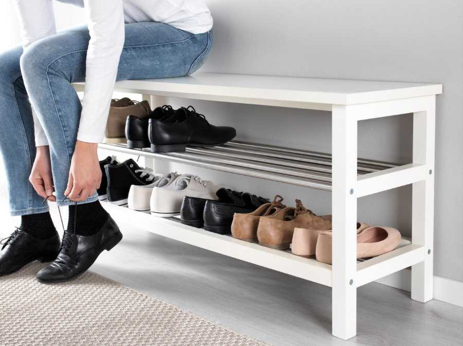 Для ежедневной обуви больше подходит обычная открытая обувница, лучше металлическая, многоярусная. Это обеспечивает постоянную вентиляцию. Очень удобно, когда верхняя часть — скамейка для переобувания.