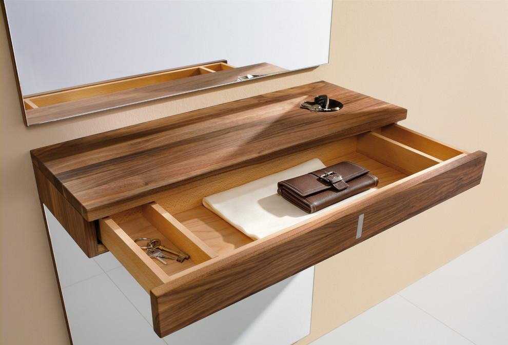 Конструкция, состоящая из зеркала с полочкой и нескольких удобных ящиков, позволит спрятать различные необходимые мелочи: косметику, ключи, перчатки. Под этой же полкой можно разместить ключницу или деревянную планку с крючками для размещения ключей.