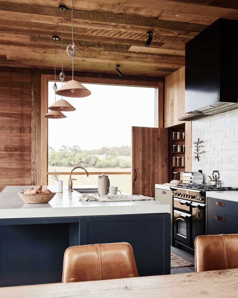Важно продумать облицовочные материалы, чтобы все поверхности было легко чистить. Обязательно обеспечить плиту мощной вытяжкой и продумать, как за декором скрыть ее колокол, не отличающийся особой эстетикой