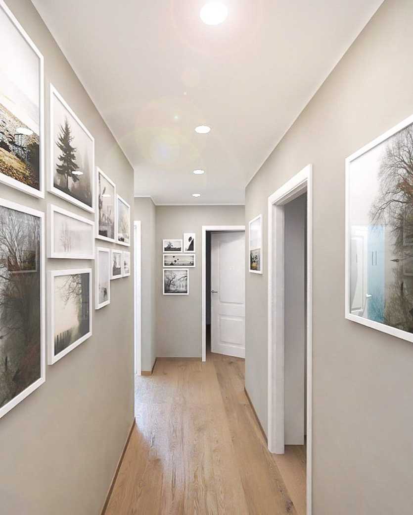 4. Арт-галерея. Если на помещение не возлагается особой функциональной нагрузки, можно превратить его в своеобразную домашнюю арт-галерею. Такой дизайн длинного коридора в квартире помогут воплотить в жизнь фото, картины, постеры, рисунки, эскизы, карты.