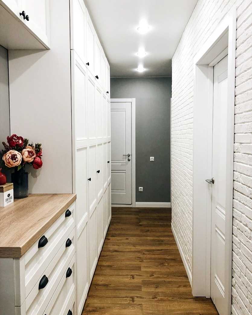 Если шкафам найдется место и в других помещениях, то можно из такого узкого коридора сделать абсолютно свободное пространство, дополненное картинами на стенах и оригинальным освещением.