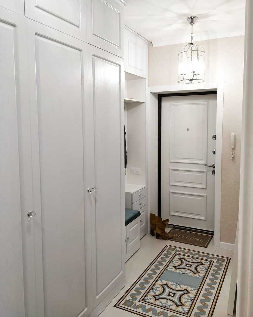 Современный – встроенный шкаф с множеством полочек, крючков, вешалок, зеркало в полный рост, длинная узкая кушетка. Пол во входной зоне оформляется ламинатом, вестибюльная часть – ковролином контрастного цвета. Потолок натяжной, пастельной расцветки.