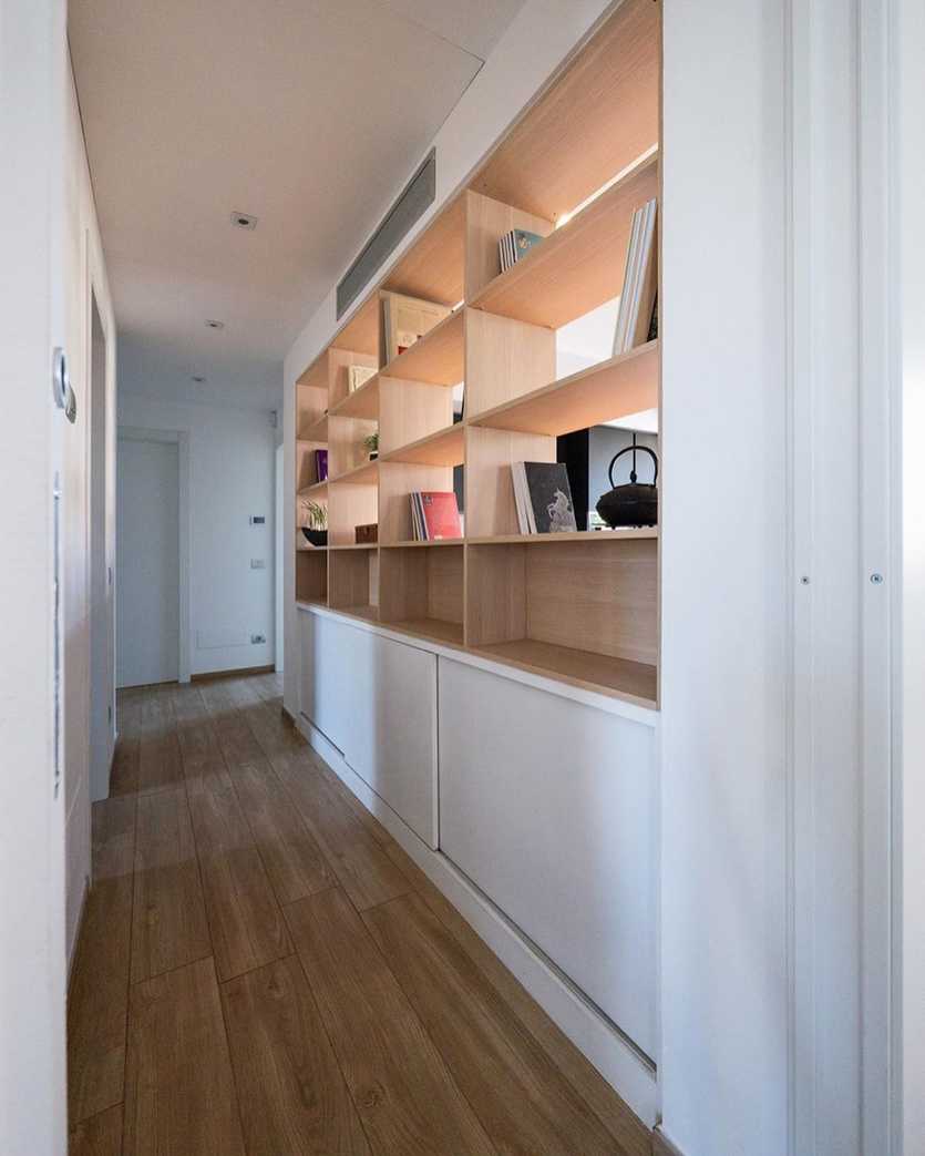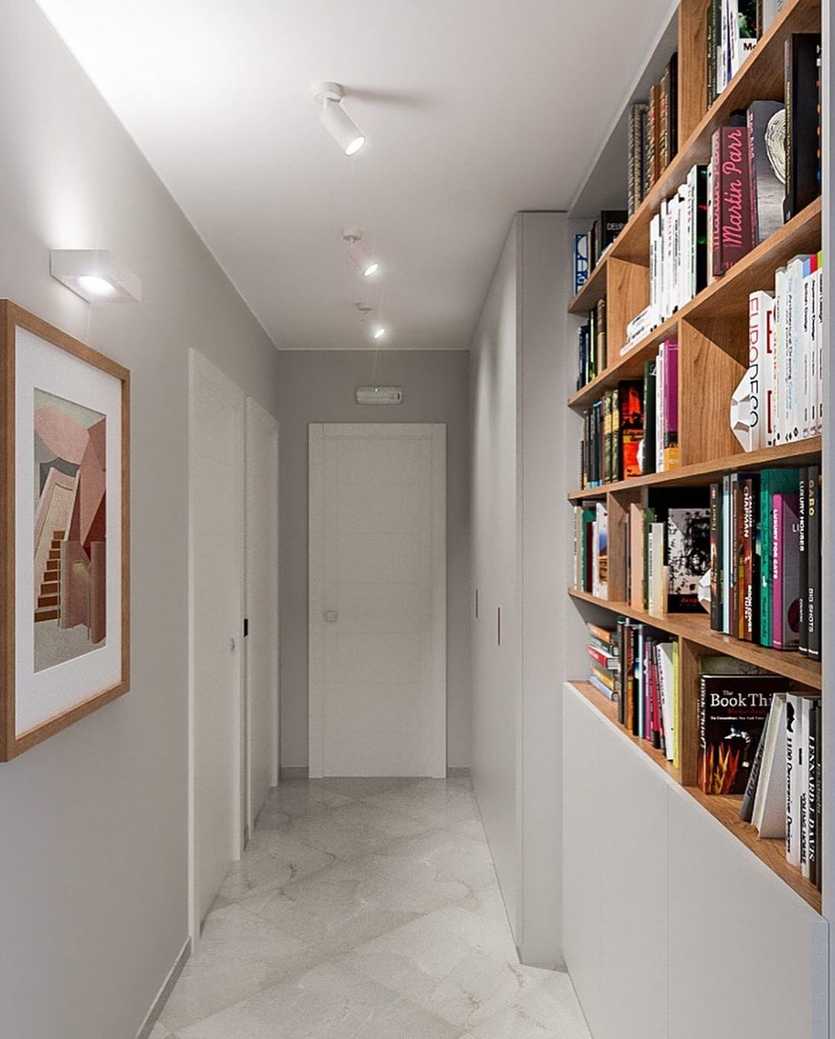 10. Коридор-библиотека. Библиофилы часто страдают от отсутствия места для домашней библиотеки. Почему бы не организовать ее в вытянутом коридорчике? Места неглубокие стеллажи или полки займут немного, а книг при этом вместят довольно много.