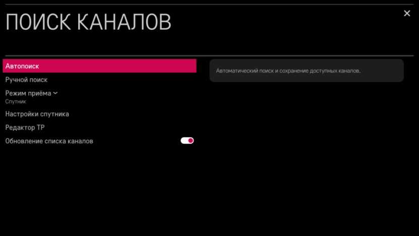 - выбираем функцию автопоиска и убираем отметку с эфирных каналов, переставляя ее на спутниковые или кабельные каналы, ориентируясь на тип подключенного кабеля к LNB;