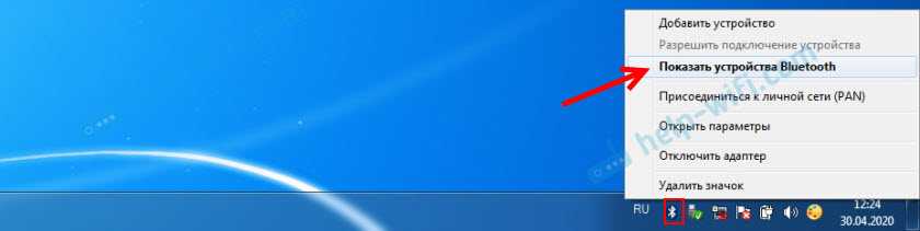 - Теперь нужно связаться с ноутбуком: удерживайте на наушниках кнопку включения, пока индикатор на них не начнёт периодично мигать. В трее в нижнем правом углу нужно найти значок Bluetooth и, кликая правой кнопкой, выбрать «Добавить устройство».