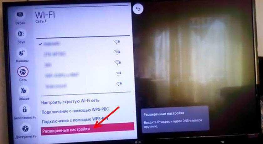 Необходимо в настройках телевизора прописать статический DNS-адрес от Google. Для этого зайдите в настройки, в раздел «Сеть» – «Подключение к сети Wi-Fi». Выбираем пункт «Расширенные настройки».
