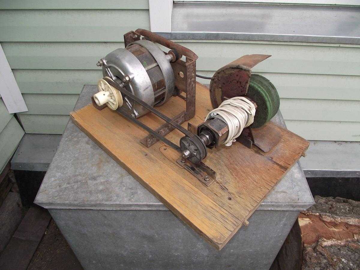 Мотор можно использовать для изготовления небольшого инструмента для работ по дереву. Токарный станок изготавливается из уголка, который служит рамой, профильных труб и других подручных материалов. Электромотор можно брать от любой старой машинки. Подойдет даже двигатель от стиральной машинки малютка. Приспособить двигатель к раме можно любым удобным способом. Самое главное, чтобы ось была выставлена параллельно опорной конструкции. На шкив мотора прикрепляется передняя бабка. Заднюю бабку изготавливают из подручных материалов и устанавливают параллельно раме. Главной деталью станка является подручник. Эта деталь выполняет функцию опоры для режущей части. Необходимо обеспечить его перемещение вдоль и поперек станины. Также стоит не забывать о надежной фиксации в процессе работы станка.