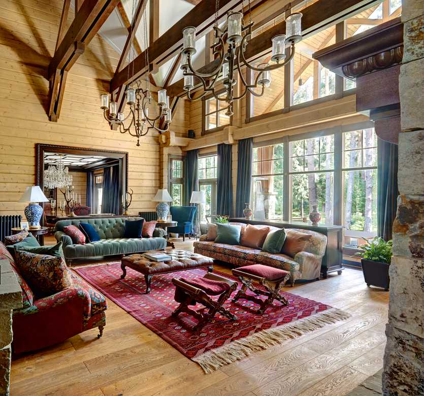 Подобные помещения довольно часто освещают при помощи массивных свисающих люстр. Здесь также устанавливают светильники и торшеры. Освещение должно смотреться красиво и при этом хорошо рассеивать искусственный свет.