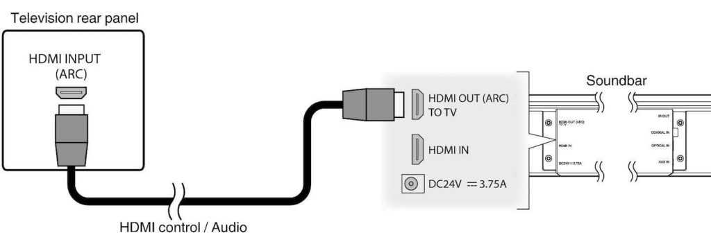 В случае отсутствия аудио/видео приемника можно использовать звуковую панель, включающую в себя второй интерфейс HDMI. Это обеспечивает прямое подключение к устройству для сохранения качества звучания. При подключении панели к ТВ через ARC будет такой же эффект взаимообмена аудио и видео информации по одному каналу.