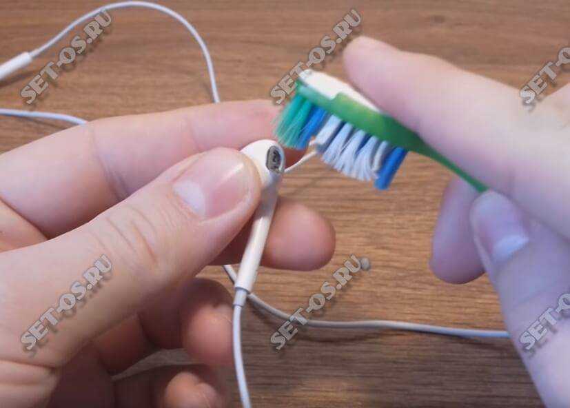 Начнём с проводных Эпл Эрподс. У них есть встроенная несъёмная сеточка, снять которую нельзя. Потому поступим так. Сначала удалим крупные загрязнения зубной щёткой: