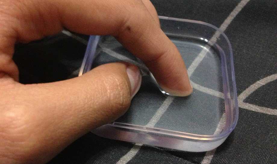 Берём подушечку, прикладываем к решётке наушника и прижимаем, чтобы клейкая масса смогла зацепить серу и грязь. После этого открываем подушечку от Эйрподс. То же самое делаем и с боковыми сеточками: