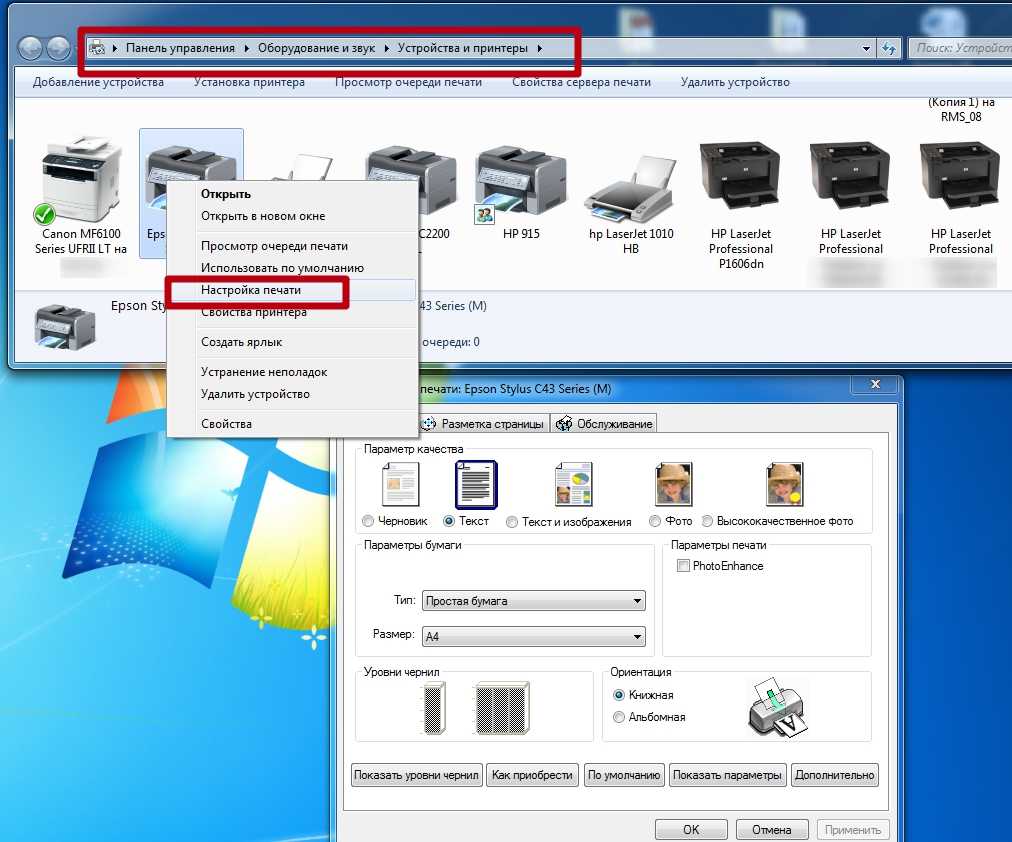 Перед началом печати настраивают все требуемые пользовательские параметры аппарата по цвету, яркости, параметрам бумаги, режимам печати «стандарт» или «с экономией чернил» и другие. Для этой цели пользователь опять входит в «Панель управления» на ПК, находит окно «Устройства и принтеры», выбирает «Принтеры и факсы» далее нажимает на нужную модель правой кнопкою мыши и переходит в свойства для настройки параметров печати.
