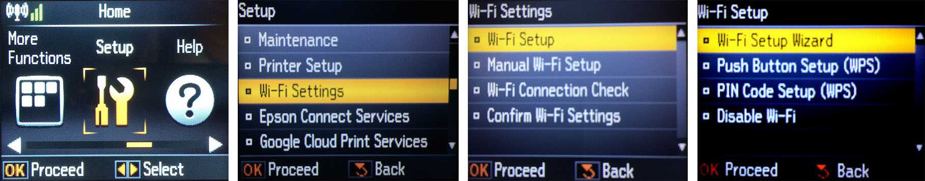 1. Подключаем принтер в вашу сеть. Заходим на панели управления принтера в настройки беспроводного подключения и запускаем мастер настройки. Будет произведен поиск всех доступных сетей. Выбираем свою по имени (SSID). Если ваша сеть не отображается или она скрыта — можно ввести имя вручную. Вводим пароль к своей сети. Если данные введены правильно, на панели управления принтера будет гореть индикатор Wi-Fi, обозначающий, что устройство в вашей сети.