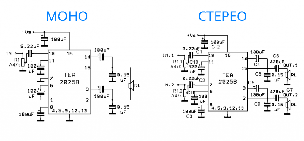 Микросхема такого звукоусилителя должна иметь не меньше шести выводов. Одна пара нужна для подключения к усилителю блока питания.