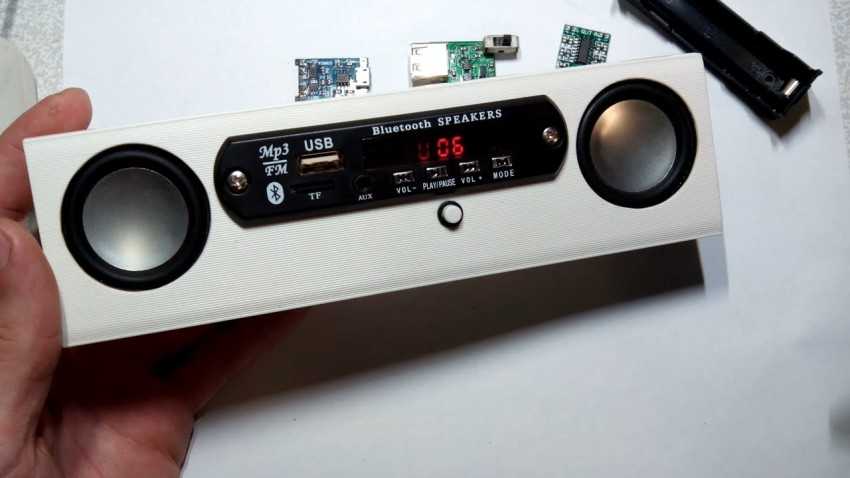 - Установить детали в пластиковый корпус подходящих размеров и конфигурации. Полученная конструкция, собранная из подручных материалов, может использоваться как портативная колонка, которая подключается к смартфону или ноутбуку.