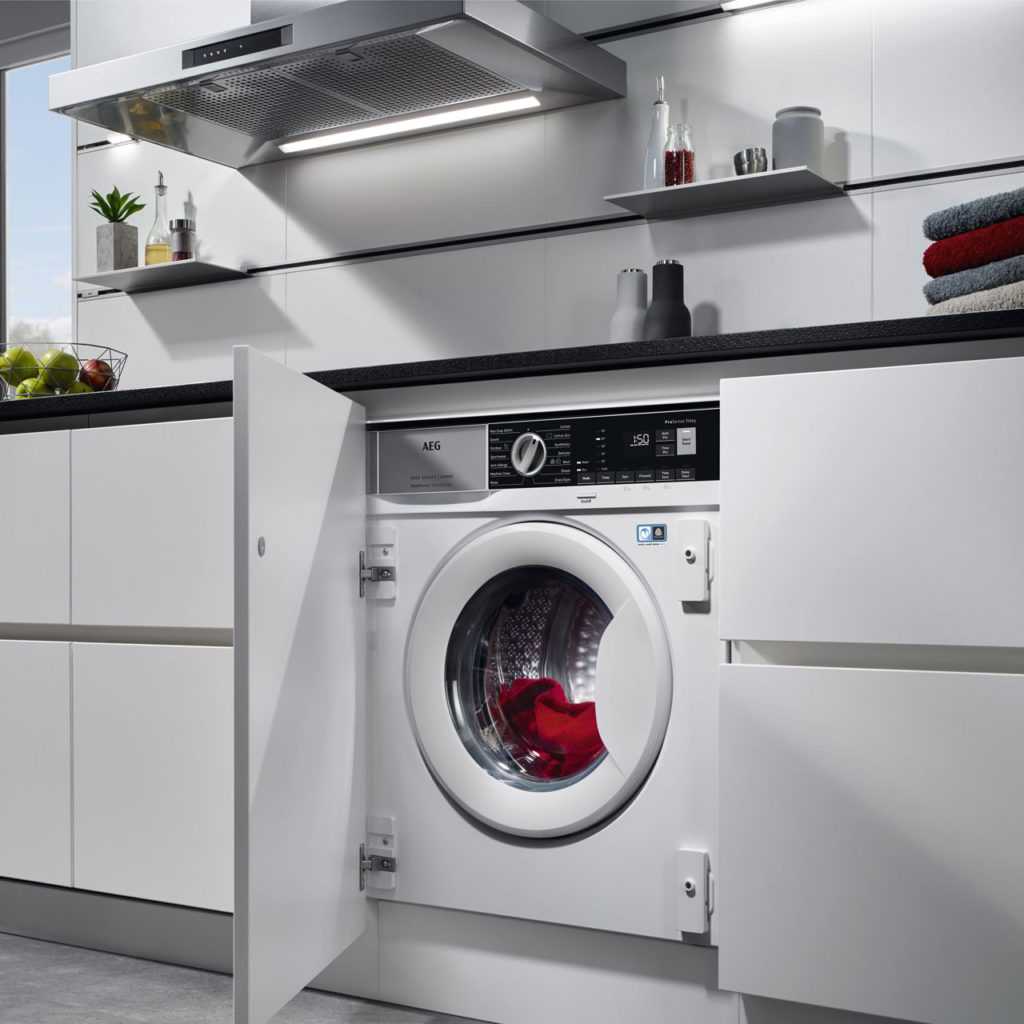 Если в ванной комнате не нашлось места для стиральной машины, проще всего разместить ее на кухне.