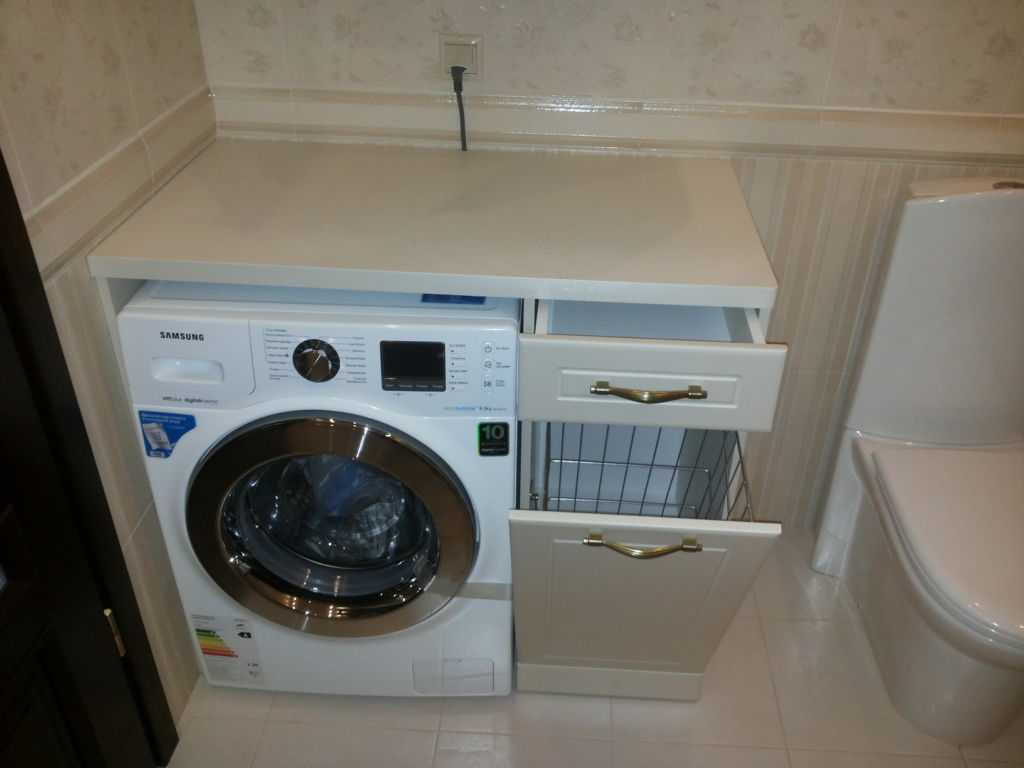 А могут быть и закрытые (машина и полочки закрыты дверками). Такой вариант удобен для семьи с детьми. Цвет дверок возможно сделать в одном стиле с интерьером ванной комнаты или кухни.