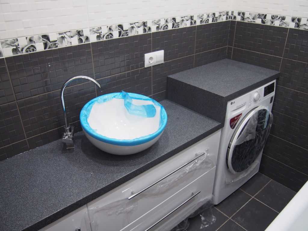 Если вы решили применить столешницу под раковину и стиральную машину, выбирайте варианты из водостойких материалов.