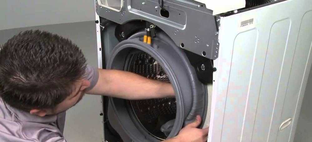 В стиральных машинах, в которых передняя панель не разборная, для замены уплотнителя требуется извлечение бака из корпуса. Это такой же процесс как и при ремонте по замене подшипников.