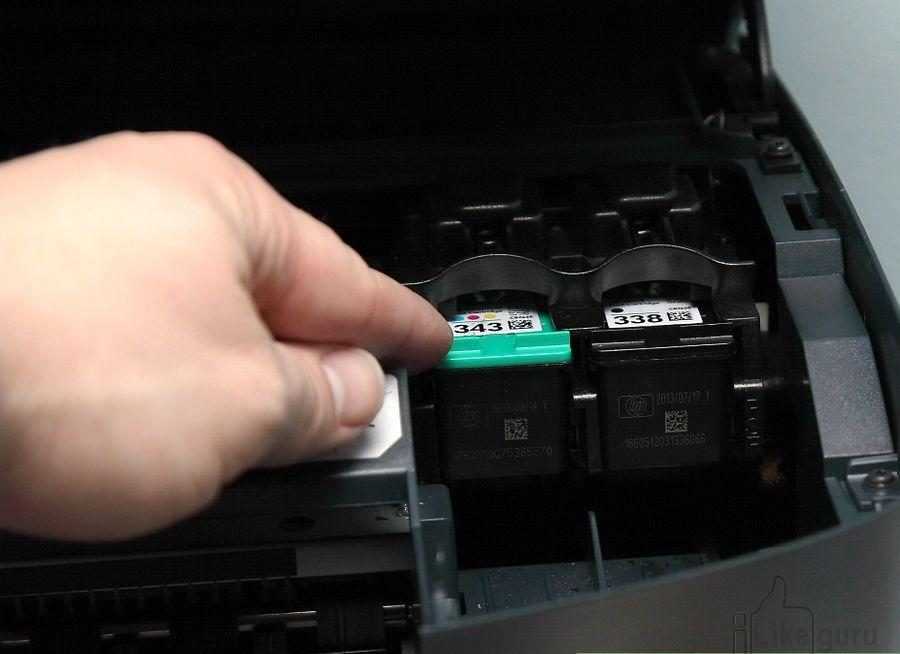 Верните наклейки и вставьте картриджи на место. Цветной располагается слева, черный – справа.