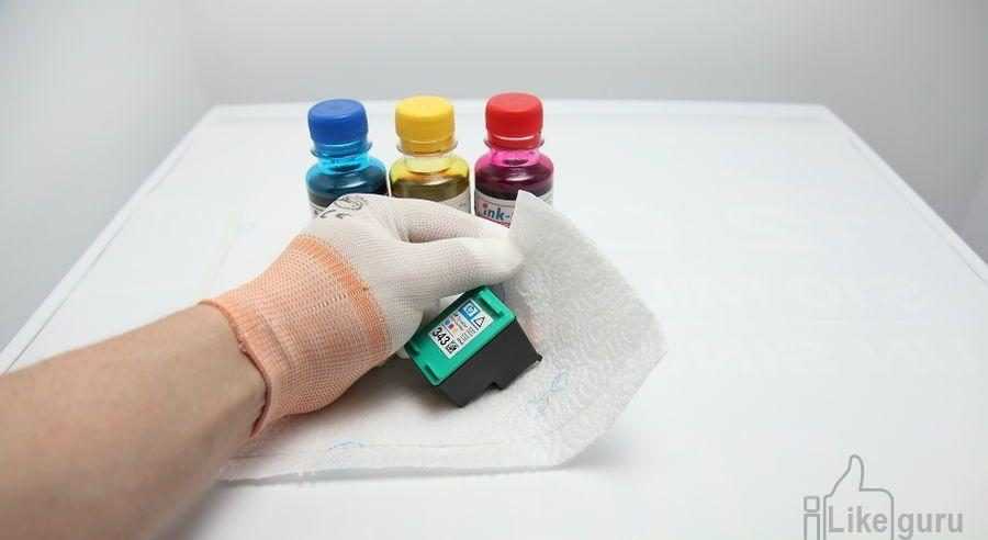 - Заправленный картридж необходимо поставить на влажную или плотную сухую салфетку и оставить примерно на 10 минут. Печатающую поверхность следует бережно протереть кусочком мягкой ткани. На этом работа окончена: контейнер с чернилами можно вставлять в принтер.