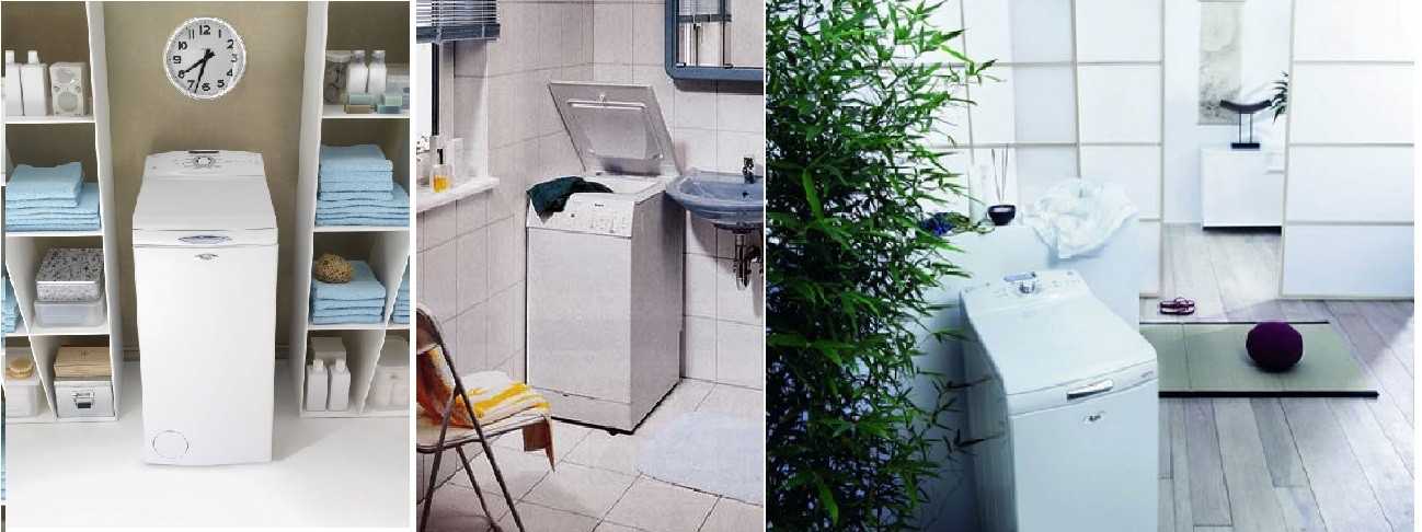 Формируя интерьерную композицию ванной комнаты или кухни, обязательно нужно учитывать размеры бытовой техники, в том числе и размеры стиральной машины. Машина автомат с верхней крышкой, как мы уже убедились, не занимает много места, тем не менее, нужно заранее предусмотреть, где ее расположить. Дизайнеры предлагают следующие решения по размещению стиральных машин такой конструкции: