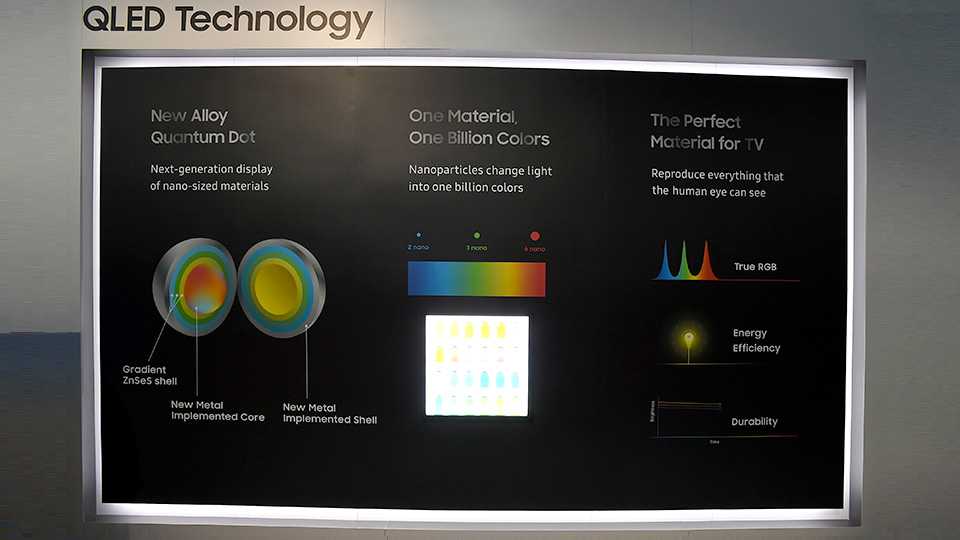 Синяя светодиодная подсветка и свет, излучаемый квантовыми точками, проходят через другие слои, такие как поляризаторы, цветные фильтры и ЖК-чипы, на экран для отображения изображений. Добавленный слой Quantum Dot позволяет телевизору QLED отображать более насыщенную и более широкую цветовую гамму (диапазон), чем ЖК-телевизоры или телевизоры LED/LCD, без добавленного слоя Quantum Dot.