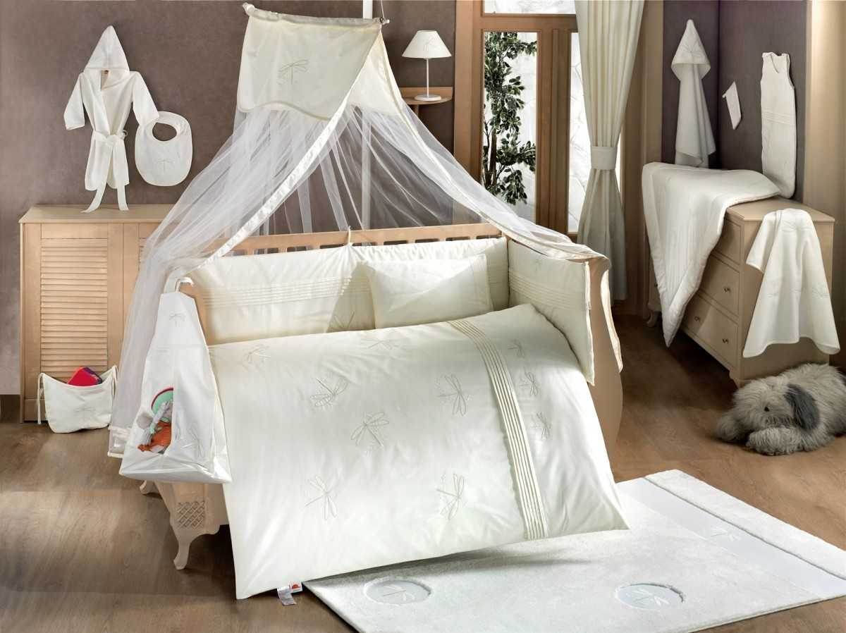 Балдахины для детских кроваток следует шить из пропускающих воздух настоящих материалов. Замечательным решением будет применение сменяемых отрезов ткани. Во время зимы плотная материя убережет ребенка от холода, а в летний период ее можно поменять на полупрозрачный тюль.