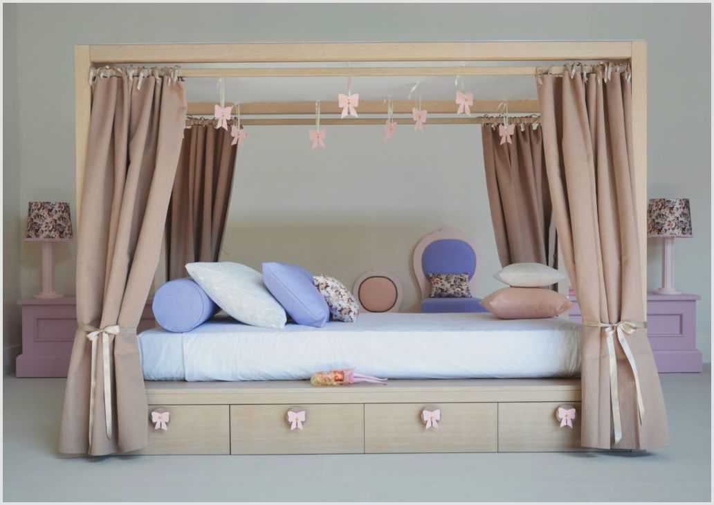 от восьми лет до совершеннолетия – ребенок уже чувствует себя почти взрослым, у него есть увлечения, которые можно частично реализовать, используя балдахин. Девичья кровать тогда станет домиком подростка-Барби, уютным дворцом принцессы со всеми сопутствующими атрибутами, мальчик почувствует себя пиратом, плывущим на корабле с парусами, водителем автофургона с зашторенными окнами.
