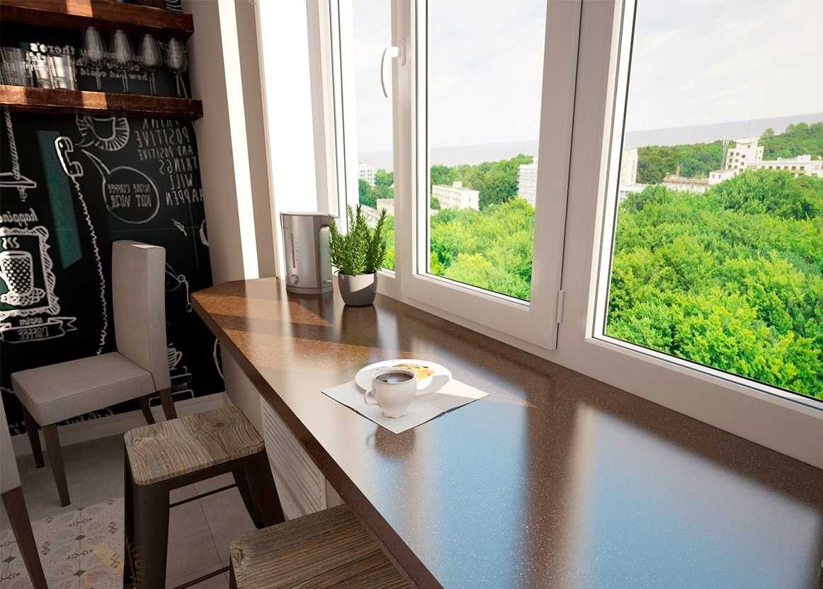 Если некуда поставить барную стойку или обеденный стол, но очень хочется это сделать, задействуйте зону подоконника. Это еще проще сделать, если в кухне есть присоединенный балкон. Для того чтобы организовать полноценное место для приема пищи, понадобится столешница и пара стульев. Поверхность можно закрыть тем же материалом, который использовался для изготовления столешницы. Стулья подойдут барные или обычные в зависимости от высоты импровизированного стола. Столешницу можно дополнить откидным или выкатным элементом, который будет использоваться исключительно во время еды. Этот вариант более удобен, так как оставляет необходимое пространство для удобного размещения ног сидящих. Кухонная утварь останется на основном полотне рабочей зоны и не будет мешать приему пищи. Увеличить полезную площадь мобильной столешницы можно, придав ему полукруглую форму. Если из вашего окна открывается замечательный вид, панорамный столик будет как нельзя более кстати.