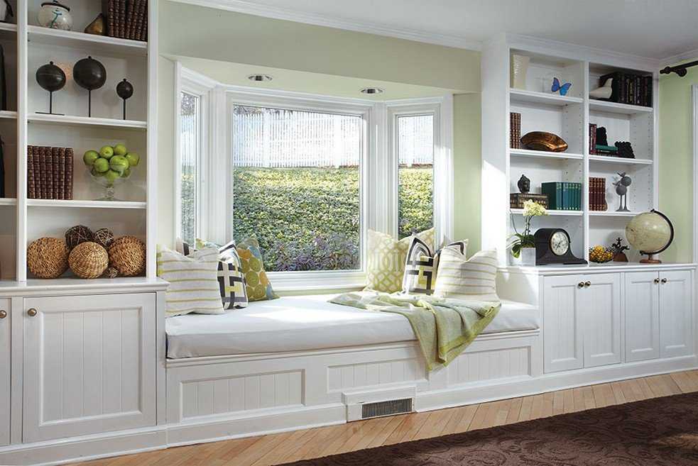 Чтобы по максимуму задействовать полезное пространство, оборудуйте конструкцию откидными крышками или выдвижными ящиками. Теперь вам точно хватит места для хранения разнообразных кухонных мелочей. При желании можно дополнить композицию шкафами, установив их с двух сторон от оконного проема.