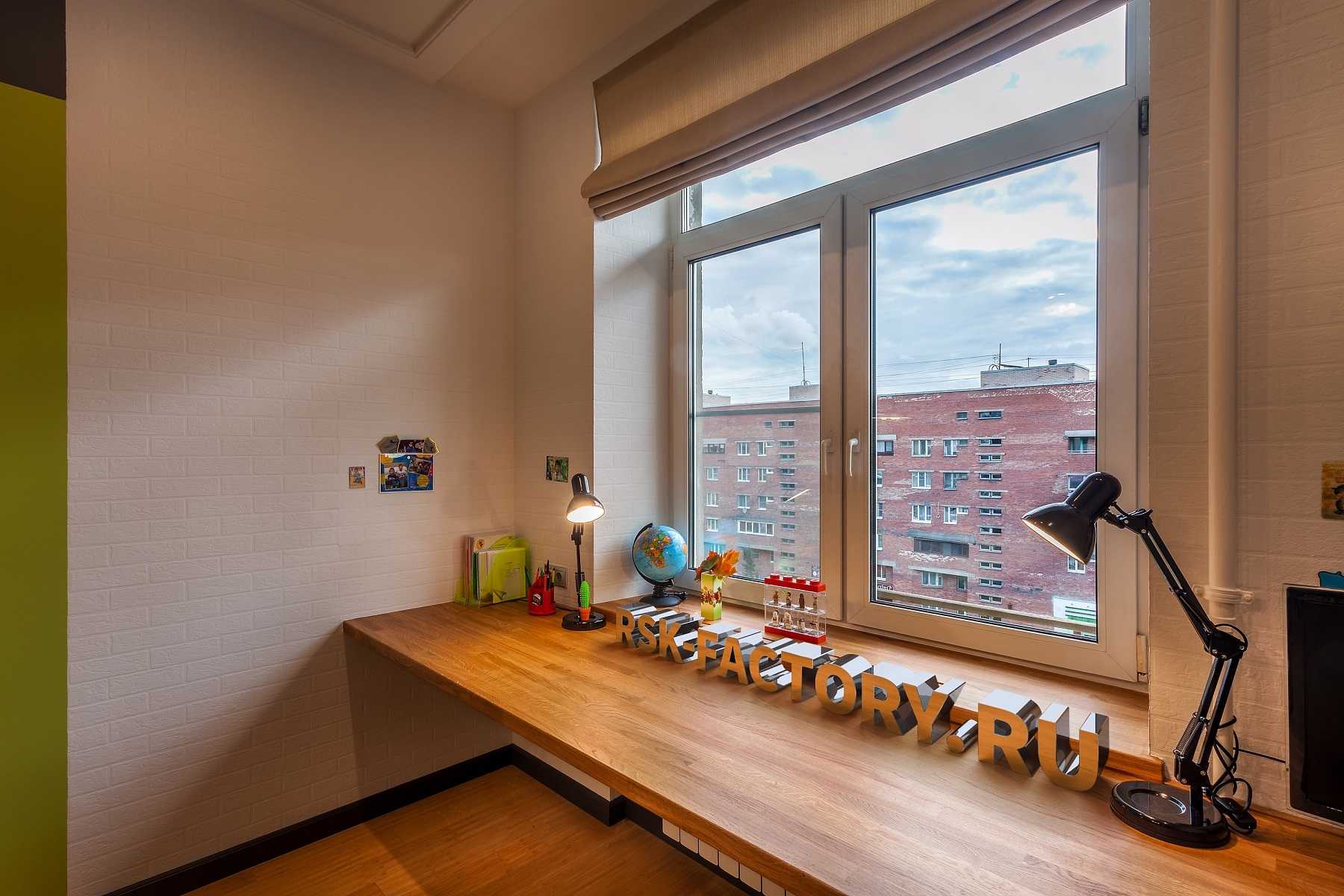 Даже в просторных комнатах может появиться длинный стол вдоль окна, часть которого выступает в роли подоконника. Это смелое решение, нестандартное, оно позволяет делать интерьер современным. Он смотрится необычно и довольно ново. Широкая столешница позволяет успешно учиться, творить, рисовать, мечтать, играть.