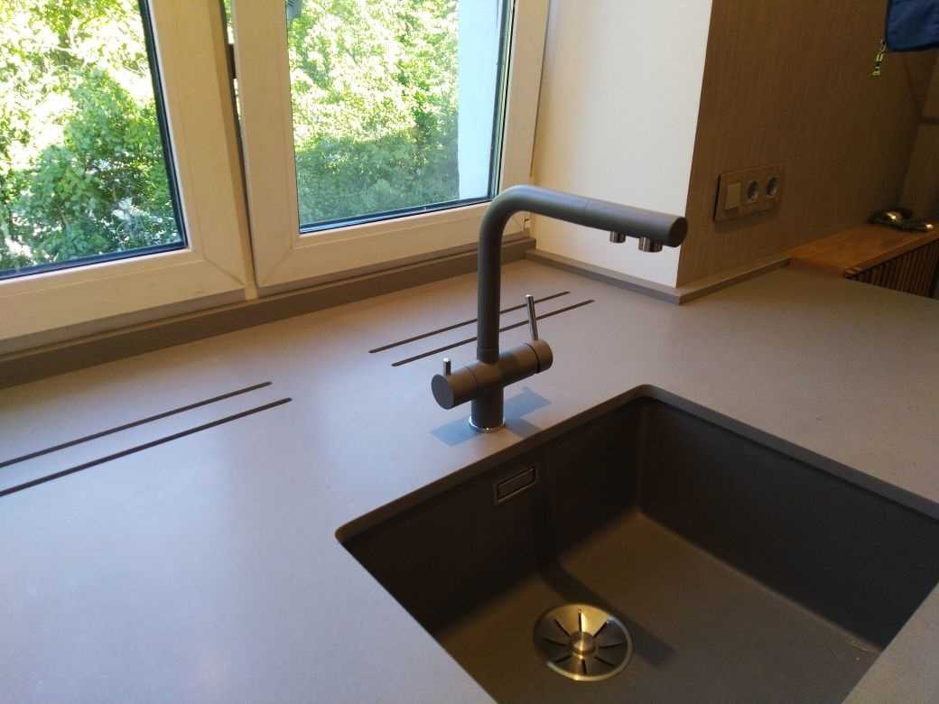 Еще одно преимущество установки столешницы вместо подоконника – возможность встроить в нее мойку. Такое расположение раковины – мечта многих хозяек. Оно делает возможным создание действительно удобного и эргономичного кухонного треугольника, позволяет освободить рабочее пространство на столешнице, размещенной вдоль стены. Кроме того, многим просто нравится во время мытья посуды любоваться красивым видом из окна.