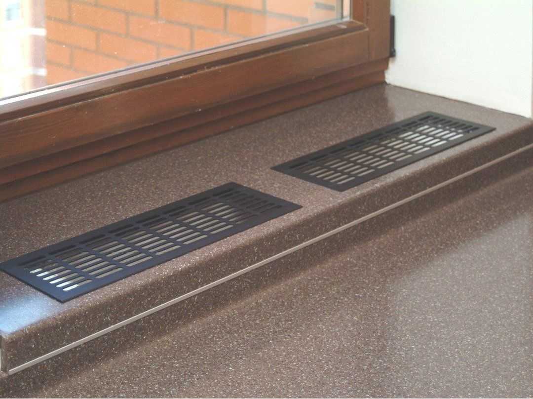 Еще один минус – столешница мешает прохождению воздушных потоков от радиатора к остеклению. В результате окна начинают потеть, на них образовывается наледь. Эту проблему решают, проделав в столешнице несколько прорезей или отверстий. Щели закрывают аккуратными вентиляционными решетками, и внешний вид рабочей поверхности не страдает.